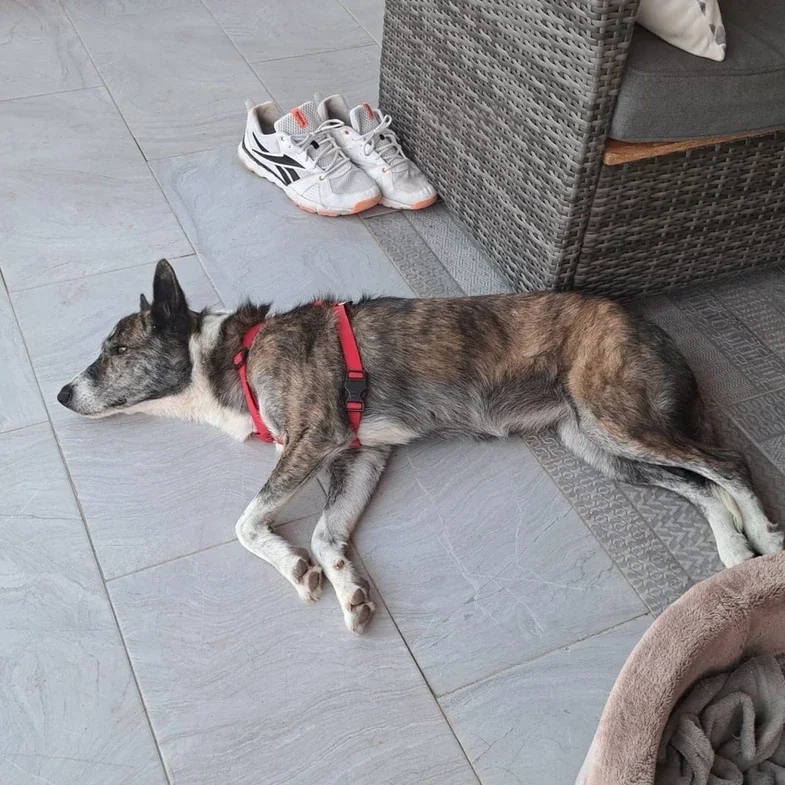 ist endlich der Hoelle entronnen. Sie lebte seit Welpenalter auf einer Muellhalde neben einem Messi-Haus, nur Dreck, Gestank, keine Decke, kein weiches Koerbchen, schon gar keine Spaziergaenge. Das man Futter in einer Schuessel serviert bekommt, war ihr neu - denn sie kannte nur die Saecke, die von Zeit zu Zeit hinuntergeworfen wurden und die sie sich selber aufreissen musste. Oben im Haus lebten zudem noch ca. 20 Katzen - alle krank und natuerlich unkastriert. Vor 2 Jahren kam dann noch ihr Hundekumpel Tomy - ein Labrador, der inzwischen ein neues Zuhause gefunden hat, dazu. Rechtlich war nichts zu machen, aber es gibt wahrscheinlich da oben jemanden, der sich auch der aermsten Tiere annimmt. Das Haus brannte - und das war die Gelegenheit fuer uns, mit Hilfe der Polizei die zwei Hunde erstmal ins Tierheim zu ueberfuehren. Die Besitzerin unterschrieb eine Verzichtserklaerung - und endlich koennen wir auch fuer Anika eine Familie suchen.
